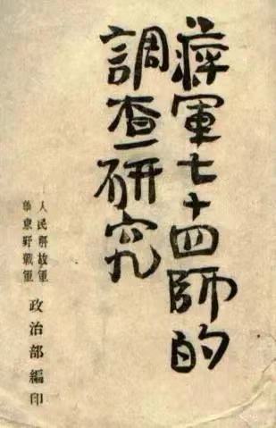 1947年,我军在孟良崮战役中战胜了国民党王牌部队七十四师。战后,华东野战军司令员兼政委陈毅等领导,指示华野政治部联络部抽调20多名得力干部,向被俘的整编第七十四师军官调查该师的历史沿革、组织编制、官兵的成分和素质、部队训练、新兵补充、参谋、补给和卫生业务、参加过的历次重大战役经过及检讨、惯用战法、该师在战略战术上对解放军的研究和对策、政治工作等方面的情况,形成了《蒋军七十四师的调查研究》。
